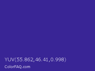 YUV 55.862,46.41,0.998 Color is a normal indigo color and the nearest color is Blue Pigment #333399. Hex code #392596 and RGB value is rgb(57,37,150). In RGB color space, this color is composed of 22% red, 15% green, 59% blue, In CMYK color space, this color is composed of 62% cyan, 75% magenta, 0% yellow , 41% black , In HSL color space, this color has a hue angle of 251° , 60% saturation and 37% lightness.
