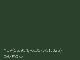 YUV 55.914,-6.367,-11.326 Color is a very dark green color and the nearest color is Kombu Green #354230. Hex code #2b412b and RGB value is rgb(43,65,43). In RGB color space, this color is composed of 17% red, 25% green, 17% blue, In CMYK color space, this color is composed of 34% cyan, 0% magenta, 34% yellow , 75% black , In HSL color space, this color has a hue angle of 120° , 20% saturation and 21% lightness.