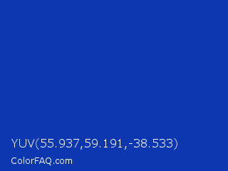 YUV 55.937,59.191,-38.533 Color is a normal blue color and the nearest color is Egyptian Blue #1034a6. Hex code #0c37b0 and RGB value is rgb(12,55,176). In RGB color space, this color is composed of 5% red, 22% green, 69% blue, In CMYK color space, this color is composed of 93% cyan, 69% magenta, 0% yellow , 31% black , In HSL color space, this color has a hue angle of 224° , 87% saturation and 37% lightness.
