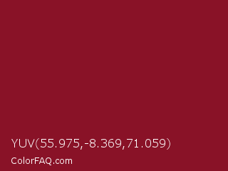 YUV 55.975,-8.369,71.059 Color is a dark red color and the nearest color is Merlot #831923. Hex code #891227 and RGB value is rgb(137,18,39). In RGB color space, this color is composed of 54% red, 7% green, 15% blue, In CMYK color space, this color is composed of 0% cyan, 87% magenta, 72% yellow , 46% black , In HSL color space, this color has a hue angle of 349° , 77% saturation and 30% lightness.
