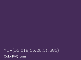 YUV 56.018,16.26,11.385 Color is a dark purple color and the nearest color is Bossanova #4e2a5a. Hex code #452b59 and RGB value is rgb(69,43,89). In RGB color space, this color is composed of 27% red, 17% green, 35% blue, In CMYK color space, this color is composed of 22% cyan, 52% magenta, 0% yellow , 65% black , In HSL color space, this color has a hue angle of 274° , 35% saturation and 26% lightness.