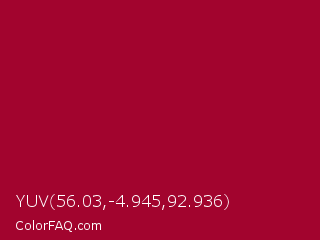YUV 56.03,-4.945,92.936 Color is a normal rose color and the nearest color is Pink Raspberry #980036. Hex code #a2042e and RGB value is rgb(162,4,46). In RGB color space, this color is composed of 64% red, 2% green, 18% blue, In CMYK color space, this color is composed of 0% cyan, 98% magenta, 72% yellow , 36% black , In HSL color space, this color has a hue angle of 344° , 95% saturation and 33% lightness.