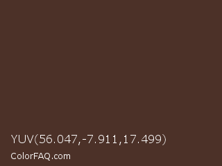 YUV 56.047,-7.911,17.499 Color is a dark color and the nearest color is Saddle #4c3024. Hex code #4c3128 and RGB value is rgb(76,49,40). In RGB color space, this color is composed of 30% red, 19% green, 16% blue, In CMYK color space, this color is composed of 0% cyan, 36% magenta, 47% yellow , 70% black , In HSL color space, this color has a hue angle of 15° , 31% saturation and 23% lightness.