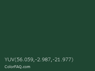 YUV 56.059,-2.987,-21.977 Color is a very dark green color and the nearest color is Everglade #1c402e. Hex code #1f4632 and RGB value is rgb(31,70,50). In RGB color space, this color is composed of 12% red, 27% green, 20% blue, In CMYK color space, this color is composed of 56% cyan, 0% magenta, 29% yellow , 73% black , In HSL color space, this color has a hue angle of 149° , 39% saturation and 20% lightness.