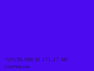 YUV 56.068,91.171,17.48 Color is a normal indigo color and the nearest color is Han Purple #5218fa. Hex code #4c0af1 and RGB value is rgb(76,10,241). In RGB color space, this color is composed of 30% red, 4% green, 95% blue, In CMYK color space, this color is composed of 68% cyan, 96% magenta, 0% yellow , 5% black , In HSL color space, this color has a hue angle of 257° , 92% saturation and 49% lightness.