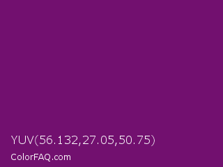 YUV 56.132,27.05,50.75 Color is a dark magenta color and the nearest color is Midnight #702670. Hex code #72106f and RGB value is rgb(114,16,111). In RGB color space, this color is composed of 45% red, 6% green, 44% blue, In CMYK color space, this color is composed of 0% cyan, 86% magenta, 3% yellow , 55% black , In HSL color space, this color has a hue angle of 302° , 75% saturation and 25% lightness.