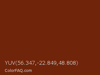 YUV 56.347,-22.849,48.808 Color is a dark orange color and the nearest color is Hairy Heath #6b2a14. Hex code #70250a and RGB value is rgb(112,37,10). In RGB color space, this color is composed of 44% red, 15% green, 4% blue, In CMYK color space, this color is composed of 0% cyan, 67% magenta, 91% yellow , 56% black , In HSL color space, this color has a hue angle of 16° , 84% saturation and 24% lightness.