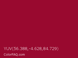 YUV 56.388,-4.628,84.729 Color is a normal rose color and the nearest color is Pink Raspberry #980036. Hex code #99092f and RGB value is rgb(153,9,47). In RGB color space, this color is composed of 60% red, 4% green, 18% blue, In CMYK color space, this color is composed of 0% cyan, 94% magenta, 69% yellow , 40% black , In HSL color space, this color has a hue angle of 344° , 89% saturation and 32% lightness.