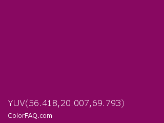 YUV 56.418,20.007,69.793 Color is a dark magenta color and the nearest color is Cardinal Pink #8c055e. Hex code #880861 and RGB value is rgb(136,8,97). In RGB color space, this color is composed of 53% red, 3% green, 38% blue, In CMYK color space, this color is composed of 0% cyan, 94% magenta, 29% yellow , 47% black , In HSL color space, this color has a hue angle of 318° , 89% saturation and 28% lightness.