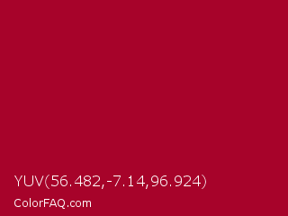 YUV 56.482,-7.14,96.924 Color is a normal red color and the nearest color is Alabama Crimson #af002a. Hex code #a7032a and RGB value is rgb(167,3,42). In RGB color space, this color is composed of 65% red, 1% green, 16% blue, In CMYK color space, this color is composed of 0% cyan, 98% magenta, 75% yellow , 35% black , In HSL color space, this color has a hue angle of 346° , 96% saturation and 33% lightness.