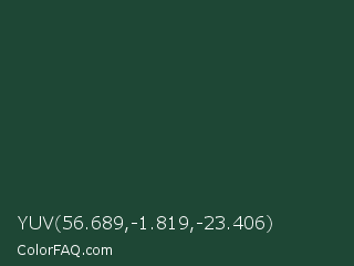 YUV 56.689,-1.819,-23.406 Color is a very dark green color and the nearest color is Te Papa Green #1e433c. Hex code #1e4735 and RGB value is rgb(30,71,53). In RGB color space, this color is composed of 12% red, 28% green, 21% blue, In CMYK color space, this color is composed of 58% cyan, 0% magenta, 25% yellow , 72% black , In HSL color space, this color has a hue angle of 154° , 41% saturation and 20% lightness.