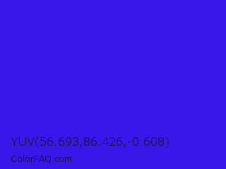 YUV 56.693,86.426,-0.608 Color is a normal indigo color and the nearest color is Bluebonnet #1c1cf0. Hex code #3817e8 and RGB value is rgb(56,23,232). In RGB color space, this color is composed of 22% red, 9% green, 91% blue, In CMYK color space, this color is composed of 76% cyan, 90% magenta, 0% yellow , 9% black , In HSL color space, this color has a hue angle of 249° , 82% saturation and 50% lightness.