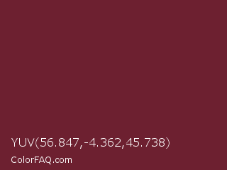 YUV 56.847,-4.362,45.738 Color is a dark red color and the nearest color is Wine #722f37. Hex code #6d2030 and RGB value is rgb(109,32,48). In RGB color space, this color is composed of 43% red, 13% green, 19% blue, In CMYK color space, this color is composed of 0% cyan, 71% magenta, 56% yellow , 57% black , In HSL color space, this color has a hue angle of 348° , 55% saturation and 28% lightness.