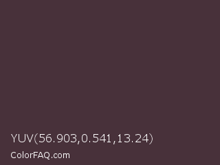 YUV 56.903,0.541,13.24 Color is a dark rose color and the nearest color is Woody Brown #483131. Hex code #48313a and RGB value is rgb(72,49,58). In RGB color space, this color is composed of 28% red, 19% green, 23% blue, In CMYK color space, this color is composed of 0% cyan, 32% magenta, 19% yellow , 72% black , In HSL color space, this color has a hue angle of 337° , 19% saturation and 24% lightness.