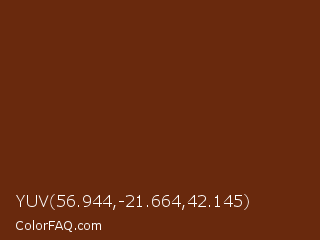 YUV 56.944,-21.664,42.145 Color is a dark orange color and the nearest color is Hairy Heath #6b2a14. Hex code #69290d and RGB value is rgb(105,41,13). In RGB color space, this color is composed of 41% red, 16% green, 5% blue, In CMYK color space, this color is composed of 0% cyan, 61% magenta, 88% yellow , 59% black , In HSL color space, this color has a hue angle of 18° , 78% saturation and 23% lightness.