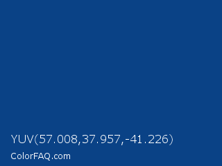 YUV 57.008,37.957,-41.226 Color is a dark blue color and the nearest color is Dark Cerulean #08457e. Hex code #0a4286 and RGB value is rgb(10,66,134). In RGB color space, this color is composed of 4% red, 26% green, 53% blue, In CMYK color space, this color is composed of 93% cyan, 51% magenta, 0% yellow , 47% black , In HSL color space, this color has a hue angle of 213° , 86% saturation and 28% lightness.