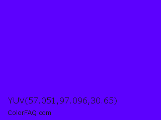 YUV 57.051,97.096,30.65 Color is a normal violet color and the nearest color is Electric Indigo #6f00ff. Hex code #5c01fe and RGB value is rgb(92,1,254). In RGB color space, this color is composed of 36% red, 0% green, 100% blue, In CMYK color space, this color is composed of 64% cyan, 100% magenta, 0% yellow , 0% black , In HSL color space, this color has a hue angle of 262° , 99% saturation and 50% lightness.