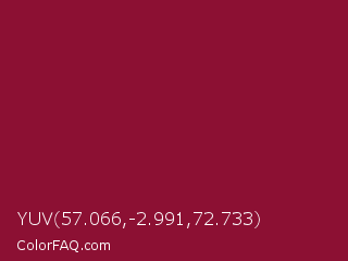 YUV 57.066,-2.991,72.733 Color is a normal rose color and the nearest color is Claret #7f1734. Hex code #8c1033 and RGB value is rgb(140,16,51). In RGB color space, this color is composed of 55% red, 6% green, 20% blue, In CMYK color space, this color is composed of 0% cyan, 89% magenta, 64% yellow , 45% black , In HSL color space, this color has a hue angle of 343° , 79% saturation and 31% lightness.