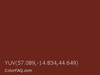 YUV 57.089,-14.834,44.649 Color is a dark red color and the nearest color is Metallic Copper #71291d. Hex code #6c251b and RGB value is rgb(108,37,27). In RGB color space, this color is composed of 42% red, 15% green, 11% blue, In CMYK color space, this color is composed of 0% cyan, 66% magenta, 75% yellow , 58% black , In HSL color space, this color has a hue angle of 7° , 60% saturation and 26% lightness.