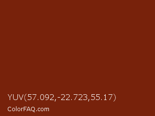 YUV 57.092,-22.723,55.17 Color is a dark red color and the nearest color is Kenyan Copper #7c1c05. Hex code #78220b and RGB value is rgb(120,34,11). In RGB color space, this color is composed of 47% red, 13% green, 4% blue, In CMYK color space, this color is composed of 0% cyan, 72% magenta, 91% yellow , 53% black , In HSL color space, this color has a hue angle of 13° , 83% saturation and 26% lightness.