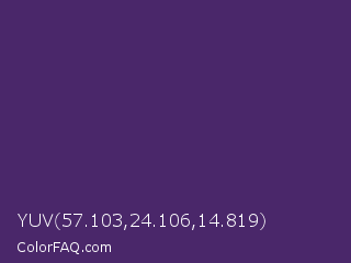 YUV 57.103,24.106,14.819 Color is a dark purple color and the nearest color is Honey Flower #4f1c70. Hex code #4a276a and RGB value is rgb(74,39,106). In RGB color space, this color is composed of 29% red, 15% green, 42% blue, In CMYK color space, this color is composed of 30% cyan, 63% magenta, 0% yellow , 58% black , In HSL color space, this color has a hue angle of 271° , 46% saturation and 28% lightness.