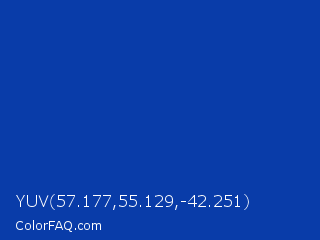 YUV 57.177,55.129,-42.251 Color is a normal blue color and the nearest color is Royal Azure #0038a8. Hex code #093ca9 and RGB value is rgb(9,60,169). In RGB color space, this color is composed of 4% red, 24% green, 66% blue, In CMYK color space, this color is composed of 95% cyan, 64% magenta, 0% yellow , 34% black , In HSL color space, this color has a hue angle of 221° , 90% saturation and 35% lightness.