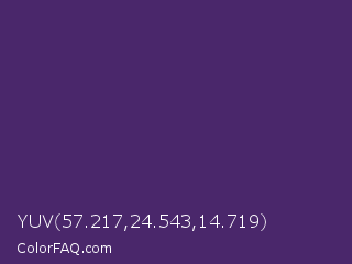 YUV 57.217,24.543,14.719 Color is a dark purple color and the nearest color is Honey Flower #4f1c70. Hex code #4a276b and RGB value is rgb(74,39,107). In RGB color space, this color is composed of 29% red, 15% green, 42% blue, In CMYK color space, this color is composed of 31% cyan, 64% magenta, 0% yellow , 58% black , In HSL color space, this color has a hue angle of 271° , 47% saturation and 29% lightness.