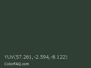 YUV 57.261,-2.594,-8.122 Color is a very dark green color and the nearest color is Kombu Green #354230. Hex code #303f34 and RGB value is rgb(48,63,52). In RGB color space, this color is composed of 19% red, 25% green, 20% blue, In CMYK color space, this color is composed of 24% cyan, 0% magenta, 17% yellow , 75% black , In HSL color space, this color has a hue angle of 136° , 14% saturation and 22% lightness.