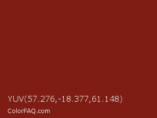 YUV 57.276,-18.377,61.148 Color is a dark red color and the nearest color is Falu Red #801818. Hex code #7f1d14 and RGB value is rgb(127,29,20). In RGB color space, this color is composed of 50% red, 11% green, 8% blue, In CMYK color space, this color is composed of 0% cyan, 77% magenta, 84% yellow , 50% black , In HSL color space, this color has a hue angle of 5° , 73% saturation and 29% lightness.