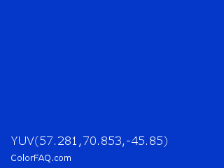 YUV 57.281,70.853,-45.85 Color is a normal blue color and the nearest color is Absolute Zero #0048ba. Hex code #0538c9 and RGB value is rgb(5,56,201). In RGB color space, this color is composed of 2% red, 22% green, 79% blue, In CMYK color space, this color is composed of 98% cyan, 72% magenta, 0% yellow , 21% black , In HSL color space, this color has a hue angle of 224° , 95% saturation and 40% lightness.