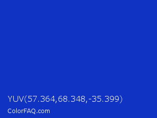 YUV 57.364,68.348,-35.399 Color is a normal blue color and the nearest color is Persian Blue #1c39bb. Hex code #1133c4 and RGB value is rgb(17,51,196). In RGB color space, this color is composed of 7% red, 20% green, 77% blue, In CMYK color space, this color is composed of 91% cyan, 74% magenta, 0% yellow , 23% black , In HSL color space, this color has a hue angle of 229° , 84% saturation and 42% lightness.