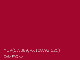YUV 57.389,-6.108,92.621 Color is a normal red color and the nearest color is Alabama Crimson #af002a. Hex code #a3062d and RGB value is rgb(163,6,45). In RGB color space, this color is composed of 64% red, 2% green, 18% blue, In CMYK color space, this color is composed of 0% cyan, 96% magenta, 72% yellow , 36% black , In HSL color space, this color has a hue angle of 345° , 93% saturation and 33% lightness.