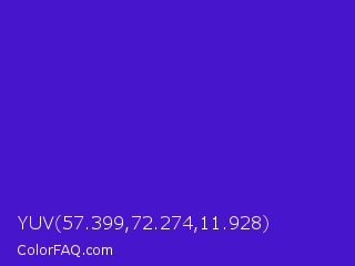 YUV 57.399,72.274,11.928 Color is a normal indigo color and the nearest color is Interdimensional Blue #360ccc. Hex code #4716cc and RGB value is rgb(71,22,204). In RGB color space, this color is composed of 28% red, 9% green, 80% blue, In CMYK color space, this color is composed of 65% cyan, 89% magenta, 0% yellow , 20% black , In HSL color space, this color has a hue angle of 256° , 81% saturation and 44% lightness.