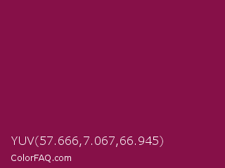 YUV 57.666,7.067,66.945 Color is a dark rose color and the nearest color is Rose Bud Cherry #800b47. Hex code #861048 and RGB value is rgb(134,16,72). In RGB color space, this color is composed of 53% red, 6% green, 28% blue, In CMYK color space, this color is composed of 0% cyan, 88% magenta, 46% yellow , 47% black , In HSL color space, this color has a hue angle of 332° , 79% saturation and 29% lightness.