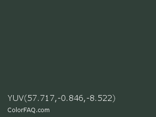YUV 57.717,-0.846,-8.522 Color is a very dark green color and the nearest color is Outer Space Crayola #2d383a. Hex code #303f38 and RGB value is rgb(48,63,56). In RGB color space, this color is composed of 19% red, 25% green, 22% blue, In CMYK color space, this color is composed of 24% cyan, 0% magenta, 11% yellow , 75% black , In HSL color space, this color has a hue angle of 152° , 14% saturation and 22% lightness.