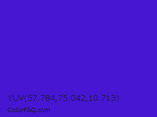 YUV 57.784,75.042,10.713 Color is a normal indigo color and the nearest color is Interdimensional Blue #360ccc. Hex code #4616d2 and RGB value is rgb(70,22,210). In RGB color space, this color is composed of 27% red, 9% green, 82% blue, In CMYK color space, this color is composed of 67% cyan, 90% magenta, 0% yellow , 18% black , In HSL color space, this color has a hue angle of 255° , 81% saturation and 45% lightness.