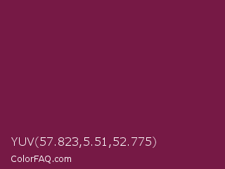 YUV 57.823,5.51,52.775 Color is a dark rose color and the nearest color is Pansy Purple #78184a. Hex code #761945 and RGB value is rgb(118,25,69). In RGB color space, this color is composed of 46% red, 10% green, 27% blue, In CMYK color space, this color is composed of 0% cyan, 79% magenta, 42% yellow , 54% black , In HSL color space, this color has a hue angle of 332° , 65% saturation and 28% lightness.