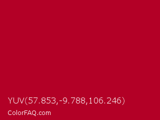 YUV 57.853,-9.788,106.246 Color is a normal red color and the nearest color is Alabama Crimson #af002a. Hex code #b30026 and RGB value is rgb(179,-0,38). In RGB color space, this color is composed of 70% red, 0% green, 15% blue, In CMYK color space, this color is composed of 0% cyan, 100% magenta, 79% yellow , 30% black , In HSL color space, this color has a hue angle of 347° , 100% saturation and 35% lightness.