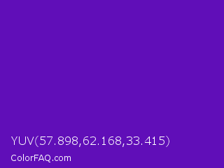 YUV 57.898,62.168,33.415 Color is a normal violet color and the nearest color is Purple Heart Crayola #652dc1. Hex code #600eb8 and RGB value is rgb(96,14,184). In RGB color space, this color is composed of 38% red, 5% green, 72% blue, In CMYK color space, this color is composed of 48% cyan, 92% magenta, 0% yellow , 28% black , In HSL color space, this color has a hue angle of 269° , 86% saturation and 39% lightness.