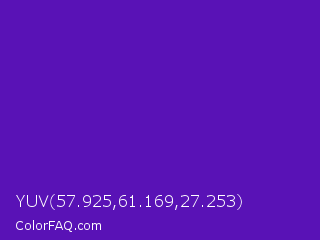 YUV 57.925,61.169,27.253 Color is a normal violet color and the nearest color is Purple Heart Crayola #652dc1. Hex code #5912b6 and RGB value is rgb(89,18,182). In RGB color space, this color is composed of 35% red, 7% green, 71% blue, In CMYK color space, this color is composed of 51% cyan, 90% magenta, 0% yellow , 29% black , In HSL color space, this color has a hue angle of 266° , 82% saturation and 39% lightness.