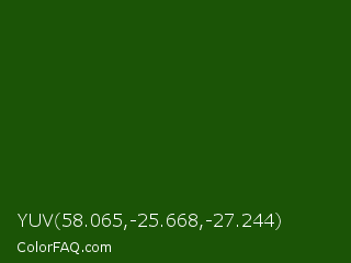 YUV 58.065,-25.668,-27.244 Color is a very dark green color and the nearest color is Lincoln Green #195905. Hex code #1b5406 and RGB value is rgb(27,84,6). In RGB color space, this color is composed of 11% red, 33% green, 2% blue, In CMYK color space, this color is composed of 68% cyan, 0% magenta, 93% yellow , 67% black , In HSL color space, this color has a hue angle of 104° , 87% saturation and 18% lightness.