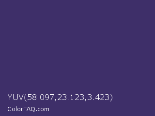 YUV 58.097,23.123,3.423 Color is a dark indigo color and the nearest color is Jacarta #3a2a6a. Hex code #3e2f69 and RGB value is rgb(62,47,105). In RGB color space, this color is composed of 24% red, 18% green, 41% blue, In CMYK color space, this color is composed of 41% cyan, 55% magenta, 0% yellow , 59% black , In HSL color space, this color has a hue angle of 256° , 38% saturation and 30% lightness.
