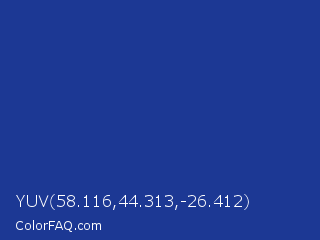 YUV 58.116,44.313,-26.412 Color is a normal blue color and the nearest color is Torea Bay #0f2d9e. Hex code #1c3894 and RGB value is rgb(28,56,148). In RGB color space, this color is composed of 11% red, 22% green, 58% blue, In CMYK color space, this color is composed of 81% cyan, 62% magenta, 0% yellow , 42% black , In HSL color space, this color has a hue angle of 226° , 68% saturation and 35% lightness.