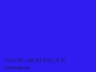YUV 58.148,89.653,-8.9 Color is a normal indigo color and the nearest color is Bluebonnet #1c1cf0. Hex code #301cf0 and RGB value is rgb(48,28,240). In RGB color space, this color is composed of 19% red, 11% green, 94% blue, In CMYK color space, this color is composed of 80% cyan, 88% magenta, 0% yellow , 6% black , In HSL color space, this color has a hue angle of 246° , 88% saturation and 53% lightness.