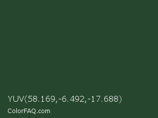 YUV 58.169,-6.492,-17.688 Color is a very dark green color and the nearest color is Cal Poly Pomona Green #1e4d2b. Hex code #26472d and RGB value is rgb(38,71,45). In RGB color space, this color is composed of 15% red, 28% green, 18% blue, In CMYK color space, this color is composed of 46% cyan, 0% magenta, 37% yellow , 72% black , In HSL color space, this color has a hue angle of 133° , 30% saturation and 21% lightness.