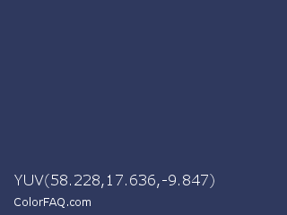 YUV 58.228,17.636,-9.847 Color is a dark blue color and the nearest color is Rhino #2e3f62. Hex code #2f395e and RGB value is rgb(47,57,94). In RGB color space, this color is composed of 18% red, 22% green, 37% blue, In CMYK color space, this color is composed of 50% cyan, 39% magenta, 0% yellow , 63% black , In HSL color space, this color has a hue angle of 227° , 33% saturation and 28% lightness.