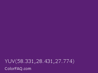 YUV 58.331,28.431,27.774 Color is a dark purple color and the nearest color is Honey Flower #4f1c70. Hex code #5a1f74 and RGB value is rgb(90,31,116). In RGB color space, this color is composed of 35% red, 12% green, 45% blue, In CMYK color space, this color is composed of 22% cyan, 73% magenta, 0% yellow , 55% black , In HSL color space, this color has a hue angle of 282° , 58% saturation and 29% lightness.