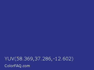 YUV 58.369,37.286,-12.602 Color is a normal blue color and the nearest color is Cosmic Cobalt #2e2d88. Hex code #2c3386 and RGB value is rgb(44,51,134). In RGB color space, this color is composed of 17% red, 20% green, 53% blue, In CMYK color space, this color is composed of 67% cyan, 62% magenta, 0% yellow , 47% black , In HSL color space, this color has a hue angle of 235° , 51% saturation and 35% lightness.