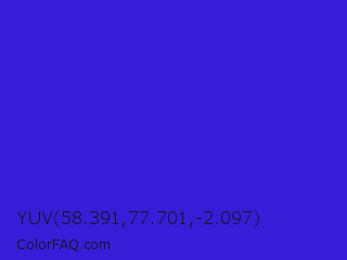 YUV 58.391,77.701,-2.097 Color is a normal indigo color and the nearest color is Interdimensional Blue #360ccc. Hex code #381dd8 and RGB value is rgb(56,29,216). In RGB color space, this color is composed of 22% red, 11% green, 85% blue, In CMYK color space, this color is composed of 74% cyan, 87% magenta, 0% yellow , 15% black , In HSL color space, this color has a hue angle of 249° , 76% saturation and 48% lightness.