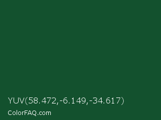 YUV 58.472,-6.149,-34.617 Color is a very dark green color and the nearest color is Cal Poly Pomona Green #1e4d2b. Hex code #13512e and RGB value is rgb(19,81,46). In RGB color space, this color is composed of 7% red, 32% green, 18% blue, In CMYK color space, this color is composed of 77% cyan, 0% magenta, 43% yellow , 68% black , In HSL color space, this color has a hue angle of 146° , 62% saturation and 20% lightness.
